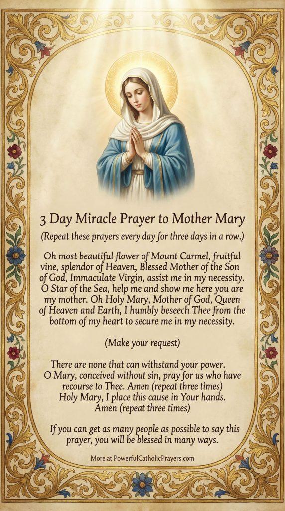 Oh most beautiful flower of Mount Carmel, fruitful vine, splendor of Heaven, Blessed Mother of the Son of God, Immaculate Virgin, assist me in my necessity. O Star of the Sea, help me and show me here you are my mother. Oh Holy Mary, Mother of God, Queen of Heaven and Earth, I humbly beseech Thee from the bottom of my heart to secure me in my necessity.