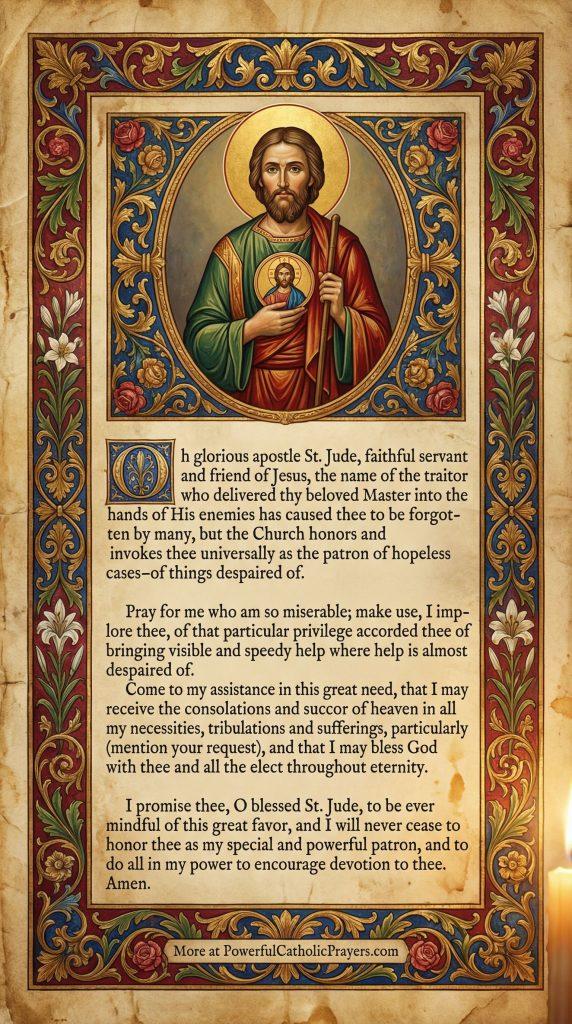 Oh glorious apostle St. Jude, faithful servant and friend of Jesus, the name of the traitor who delivered thy beloved Master into the hands of His enemies has caused thee to be forgotten by many, but the Church honors and invokes thee universally as the patron of hopeless cases–of things despaired of. Pray for me who am so miserable; make use, I implore thee, of that particular privilege accorded thee of bringing visible and speedy help where help is almost despaired of. Come to my assistance in this great need, that I may receive the consolations and succor of heaven in all my necessities, tribulations and sufferings, particularly (mention your request), and that I may bless God with thee and all the elect throughout eternity. I promise thee, O blessed St. Jude, to be ever mindful of this great favor, and I will never cease to honor thee as my special and powerful patron, and to do all in my power to encourage devotion to thee. Amen.